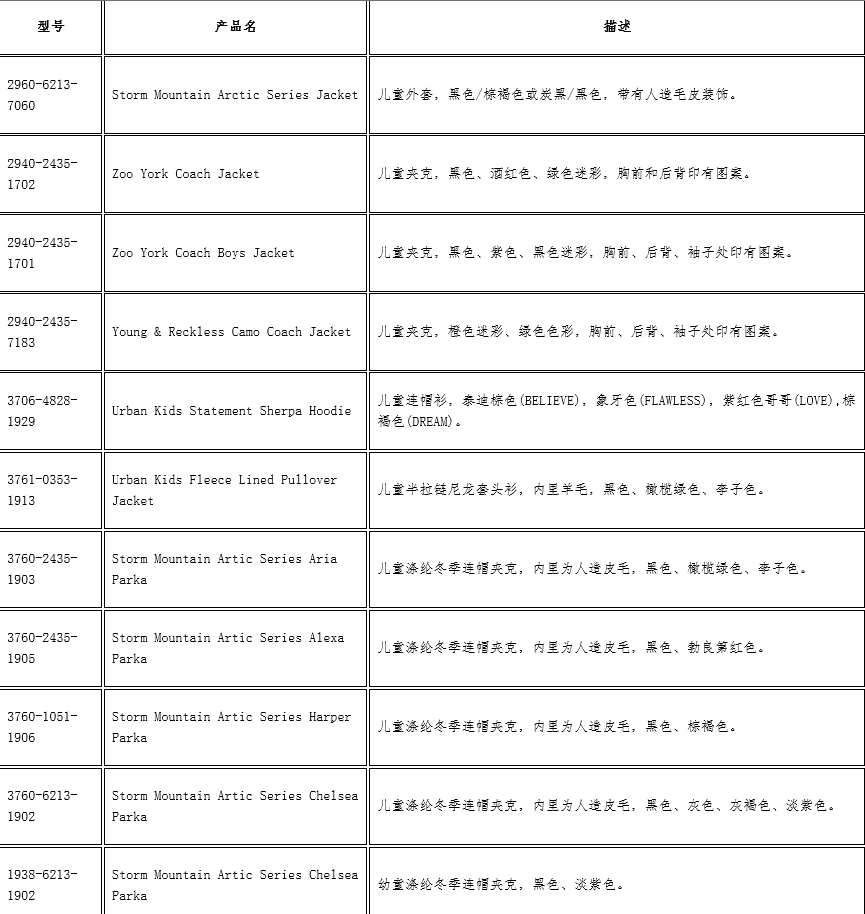 此次召回產(chǎn)品為兒童外套,帽子或腰部有拉繩和扣子。具體召回產(chǎn)品如下: