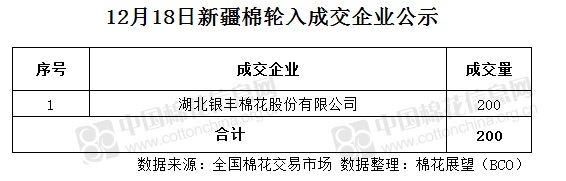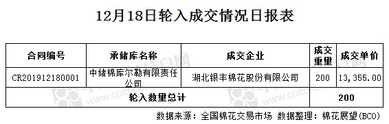 12月18日,中國儲備棉管理有限公司計劃采購新疆棉7000噸,實際成交200噸,成交率2.86%,成交均價13355元/噸,較17日跌42元/噸,成交最高價13355元/噸,較17日跌60元/噸,成交最低價13355元/噸,較17日跌20元/噸。其中新疆庫成交200噸,內(nèi)地庫成交0噸。