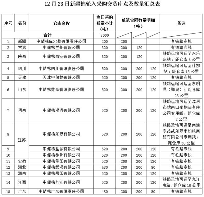中國儲備棉管理有限公司定于2019年12月23日采購新疆棉7000噸(公定重量),最高限價13522元/噸(折標(biāo)準(zhǔn)級3128B價格)。具體庫點及數(shù)量如下: