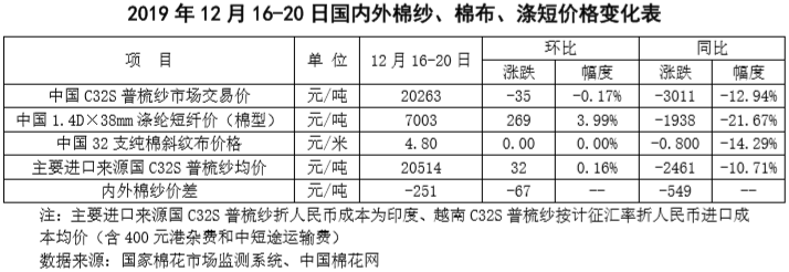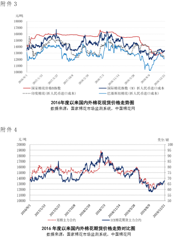 本周,市場樂觀預(yù)期中美達(dá)成第一階段經(jīng)貿(mào)協(xié)議共識后,中國貿(mào)易商會或增加對美棉采購量,推動國際棉價上漲。2019年12月16-20日紐約棉花期貨主力合約結(jié)算價67.14美分/磅,較上周上漲0.92美分/磅,漲幅1.37%,代表進(jìn)口棉中國主港到岸均價的國際棉花指數(shù)(M)75.96美分/磅,較上周上漲0.03美分/磅,漲幅0.03%,折人民幣進(jìn)口成本13327元/噸(含港雜及運(yùn)輸費(fèi)),較上周上漲4元/噸,漲幅0.03%;國家棉花價格B指數(shù)高于國際棉花指數(shù)(M)折人民幣進(jìn)口成本高于18元/噸,上周是國際棉花指數(shù)(M)折人民幣進(jìn)口成本高于國家棉花價格B指數(shù)99元/噸。