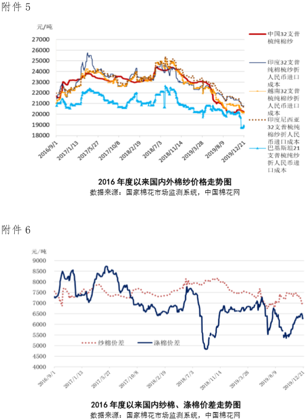 國際棉價上漲高度有限。繼中美第一階段經(jīng)貿(mào)協(xié)議文本達(dá)成一致后,12月20日晚國家主席習(xí)近平應(yīng)約同美國總統(tǒng)特朗普通電話,貿(mào)易擔(dān)憂情緒暫時得到緩解。周四美國眾議院通過對特朗普彈劾條款,由于投資者預(yù)計彈劾案不會在參議院獲得通過,市場表現(xiàn)平靜,接下來一周歐美多數(shù)國家將迎來圣誕假期,市場波動受限。國際棉花市場方面,據(jù)美國農(nóng)業(yè)部12月報告顯示,2019/20年度全球棉花產(chǎn)量2636.8萬噸,同比增加2.55%,棉花消費(fèi)量2618.6萬噸,同比下降0.02%,產(chǎn)大于需18.2萬噸。當(dāng)前國際棉花市場處新棉集中上市期,美國新棉收獲進(jìn)度接近90%。印度CCI收購未能將籽棉價格提升到MSP之上,導(dǎo)致近幾周印度棉價持續(xù)下跌。南半球巴西棉花開始播種,美國農(nóng)業(yè)參贊最新預(yù)計,今年巴西棉花面積和產(chǎn)量增長幅度在1.85%和0.88%。現(xiàn)貨市場,中國簽約美棉量增加,2019年12月6-12日2019/20年度美國陸地棉凈簽約量5.65萬噸,較前周減少10%,其中中國簽約量5692噸。國際棉紗市場整體平穩(wěn),局部棉紗價格小幅上漲,好于市場預(yù)期,印度紗和越南紗走貨尚可,巴基斯坦紗銷售略顯壓力,整體市場仍以謹(jǐn)慎操作為主,并無放量。下周圣誕節(jié)假期臨近,預(yù)計市場交投趨弱,由于貿(mào)易憂慮未完全消退,國際棉價上漲高度受限。