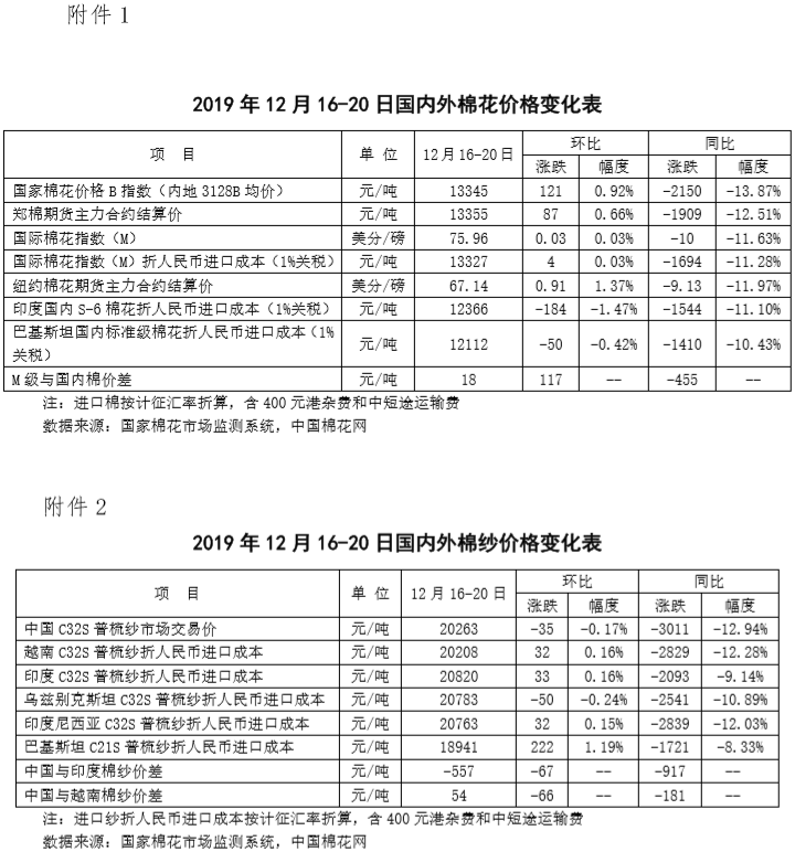 本周,市場仍在消化中美達(dá)成第一階段經(jīng)貿(mào)協(xié)議消息,推動國內(nèi)棉價繼續(xù)小幅上漲。2019年12月16-20日代表內(nèi)地標(biāo)準(zhǔn)級皮棉銷售價格的國家棉花價格B指數(shù)均價13345元/噸,較上周上漲121元/噸,漲幅0.92%;鄭州棉花期貨主力合約結(jié)算均價13355元/噸,較上周上漲87元/噸,漲幅0.66%。