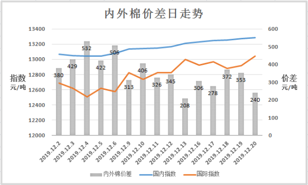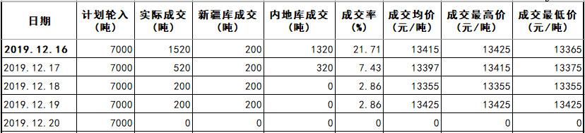 上周(2019年12月16-20日)是2019年度新疆棉輪入第三周,中國儲備棉管理有限公司計(jì)劃采購新疆棉3.5萬噸,實(shí)際成交2440噸,最高限價13425元/噸,成交均價13398元/噸,較前周上漲101元/噸。內(nèi)外棉價差240-372元/噸,未達(dá)到800元/噸警戒線。