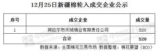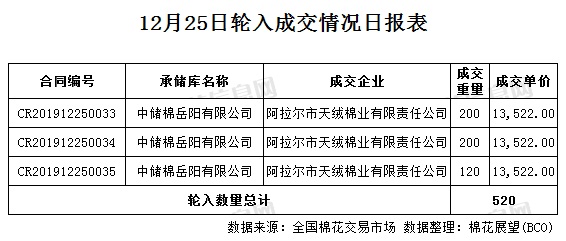 12月25日,中國儲(chǔ)備棉管理有限公司計(jì)劃采購新疆棉7000噸,實(shí)際成交520噸,成交率7.43%,成交均價(jià)13522元/噸,較23日持平,成交最高價(jià)13522元/噸,較23日持平,成交最低價(jià)13522元/噸,較23日持平。其中新疆庫成交0噸,內(nèi)地庫成交520噸。