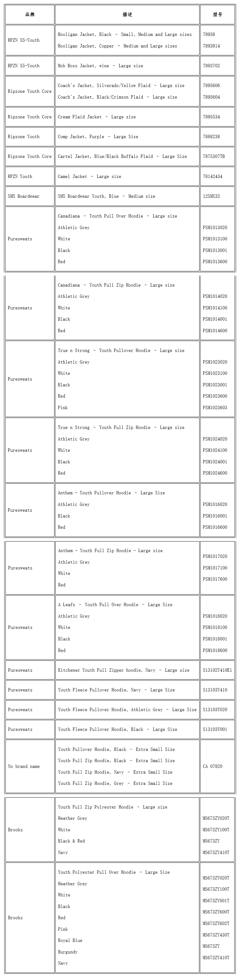 此次召回產(chǎn)品為兒童外套,帽子或腰部有拉繩和扣子。具體召回產(chǎn)品如下: