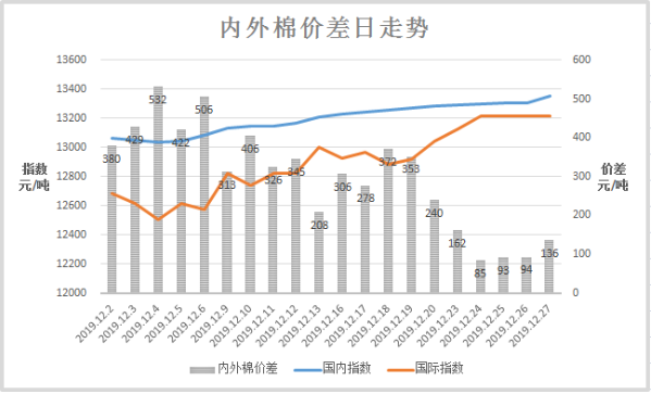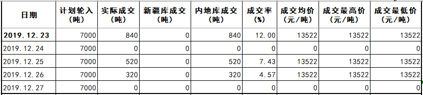 上周(2019年12月23-27日)是2019年度新疆棉輪入第四周,中國(guó)儲(chǔ)備棉管理有限公司累計(jì)掛牌采購(gòu)新疆棉3.50萬噸,實(shí)際成交1680噸,最高限價(jià)13522元/噸,成交均價(jià)13522元/噸,較前周上漲124元/噸。內(nèi)外棉價(jià)差85-162元/噸,未達(dá)到800元/噸警戒線。