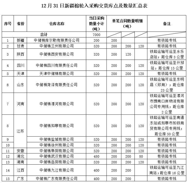 中國儲備棉管理有限公司定于2019年12月31日采購新疆棉7000噸(公定重量),最高限價(jià)13578元/噸(折標(biāo)準(zhǔn)級3128B價(jià)格)。具體庫點(diǎn)及數(shù)量如下: