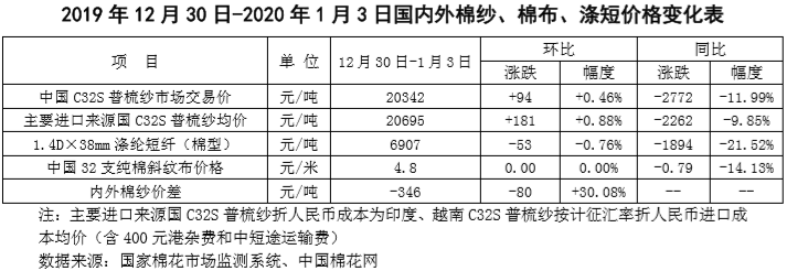 本周,受鄭棉期貨大漲推動(dòng),現(xiàn)貨市場(chǎng)看漲情緒濃厚,內(nèi)外棉價(jià)差持續(xù)擴(kuò)大。2019年12月30日-2020年1月3日,中央儲(chǔ)備棉連續(xù)4天無成交記錄,國(guó)內(nèi)市場(chǎng)棉花現(xiàn)貨價(jià)格指數(shù)均價(jià)13598元/噸(中國(guó)棉花價(jià)格指數(shù)(312B品種)和國(guó)家棉花價(jià)格指數(shù)(3128B)算術(shù)平均值),較上周上漲286元/噸,漲幅2.15%,國(guó)際市場(chǎng)棉花現(xiàn)貨價(jià)格指數(shù)(考特魯克A指數(shù))均價(jià)78.04美分/磅,較上周上漲0.56美分/磅,漲幅0.72%,折人民幣進(jìn)口成本13266元/噸,較上周上漲80元/噸,漲幅0.61%;內(nèi)外棉價(jià)差332元/噸,價(jià)差較上周擴(kuò)大203元/噸。