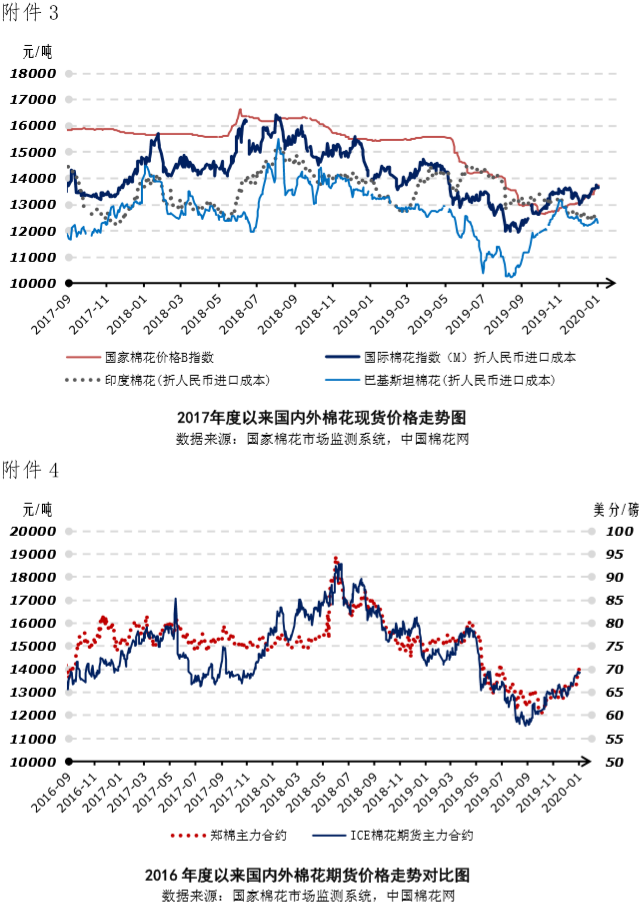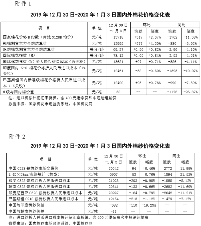 本周,周初中美經(jīng)貿(mào)磋商跟進(jìn)消息繼續(xù)增強(qiáng)市場(chǎng)預(yù)期,中國(guó)央行宣布下調(diào)金融機(jī)構(gòu)存款準(zhǔn)備金率0.5個(gè)百分點(diǎn),周末國(guó)際局勢(shì)惡化,棉花市場(chǎng)整體上漲。2019年12月30日-2020年1月3日代表內(nèi)地標(biāo)準(zhǔn)級(jí)皮棉銷售價(jià)格的國(guó)家棉花價(jià)格B指數(shù)均價(jià)13718元/噸,較上周上漲317元/噸,漲幅2.37%;鄭州棉花期貨主力合約結(jié)算均價(jià)13995元/噸,較上周上漲577元/噸,漲幅4.30%。鄭棉期貨先揚(yáng)后抑,現(xiàn)貨周后期漲幅顯著收斂。1月3日鄭棉主力合約結(jié)算價(jià)14035元/噸,比前日下跌35元/噸。12月30及31日、1月2日及3日國(guó)棉現(xiàn)貨價(jià)格較前一日上漲幅度1.58%、0.21%、0.15%、0.19%。