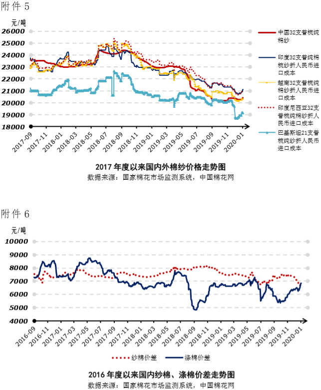 關(guān)注下游持續(xù)跟漲能力,提防外部風(fēng)險(xiǎn)。國(guó)家統(tǒng)計(jì)局公布的2019年12月制造業(yè)PMI為50.2,環(huán)比持平,連續(xù)2個(gè)月位于擴(kuò)張區(qū)間。元旦節(jié)期間,中國(guó)人民銀行決定于2020年1月6日下調(diào)存款準(zhǔn)備金率0.5個(gè)百分點(diǎn),向金融系統(tǒng)釋放8000億元規(guī)模流動(dòng)性,本次降準(zhǔn)為全面降準(zhǔn),意在鞏固宏觀經(jīng)濟(jì)企穩(wěn)勢(shì)頭。國(guó)內(nèi)棉花市場(chǎng)方面,據(jù)國(guó)家棉花市場(chǎng)監(jiān)測(cè)系統(tǒng)數(shù)據(jù)顯示,按照國(guó)內(nèi)棉花預(yù)計(jì)產(chǎn)量584.3萬噸(國(guó)家棉花市場(chǎng)監(jiān)測(cè)系統(tǒng)2019年11月預(yù)測(cè))測(cè)算,截至1月3日全國(guó)累計(jì)交售籽棉折皮棉572.3萬噸,交售率97.9%,加工率94.5%,銷售率38.4%。隨著近期鄭棉期貨快速上漲,注冊(cè)倉單數(shù)量持續(xù)加大,本周總數(shù)量突破110萬噸,截止12月末,張家港外棉總庫存超過5.8萬噸,多方面顯示短期供應(yīng)壓力仍較大。受原料價(jià)格上行帶動(dòng),純棉紗價(jià)格跟隨上漲,下游備貨情緒上升,但部分織廠已臨近放假,備貨不多。整體看紗廠庫存有所下降,整體產(chǎn)銷形勢(shì)略有好轉(zhuǎn),盈利水平小幅回升,純棉紗走貨較12月中上旬有所好轉(zhuǎn),但幅度不大。2020年第1周國(guó)際局勢(shì)惡化,本周現(xiàn)貨周后期漲勢(shì)顯著收斂,鄭棉走勢(shì)于周末出現(xiàn)下跌,金融市場(chǎng)趨于謹(jǐn)慎,需要提防外部市場(chǎng)不確定性帶來的負(fù)面影響。
