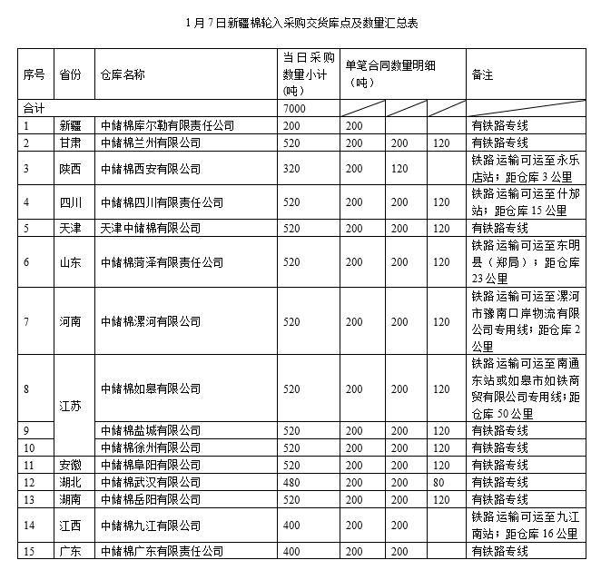 中國儲備棉管理有限公司定于2020年1月7日采購新疆棉7000噸(公定重量),最高限價13869元/噸(折標準級3128B價格)。具體庫點及數量如下: