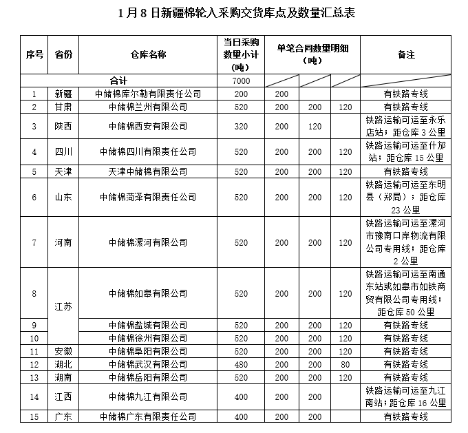 中國儲(chǔ)備棉管理有限公司定于2020年1月8日采購新疆棉7000噸(公定重量),最高限價(jià)13869元/噸(折標(biāo)準(zhǔn)級(jí)3128B價(jià)格)。具體庫點(diǎn)及數(shù)量如下:
