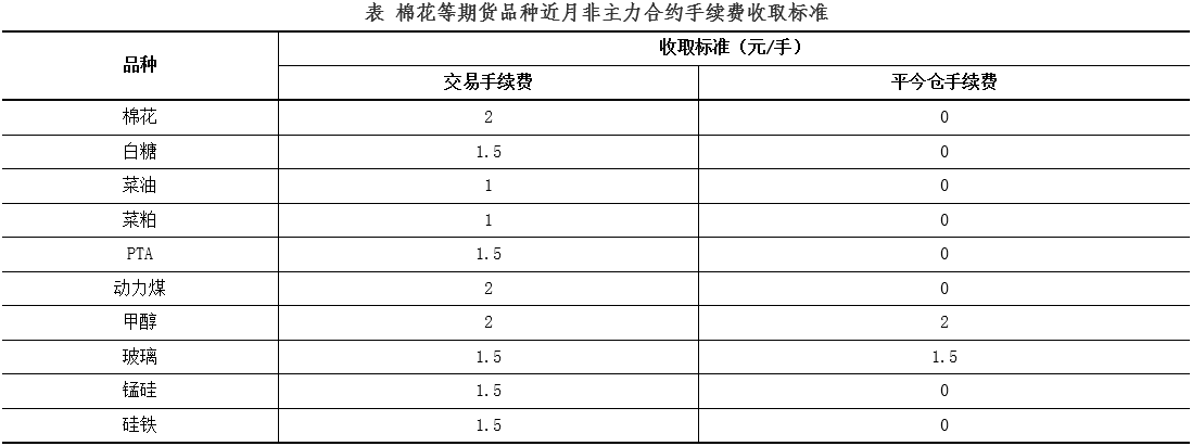 根據(jù)《鄭州商品交易所期貨結(jié)算細(xì)則》第二十七條規(guī)定,經(jīng)研究決定,自2020年1月31日當(dāng)晚夜盤(pán)交易時(shí)起,對(duì)棉花等10個(gè)期貨品種交割月份在[N+2,N+5](N為當(dāng)月月份)區(qū)間內(nèi)的非1、5、9合約,手續(xù)費(fèi)標(biāo)準(zhǔn)調(diào)整如下表。