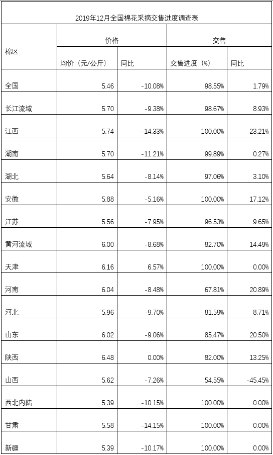 12月中國棉花協會棉農分會對內地12個省市和新疆自治區(qū)260多個縣、市近2000個定點農戶進行棉花交售情況調查,調查結果顯示:全國棉花采摘全部結束,交售進度快于去年同期,為98.55%,同比增加1.79個百分點,交售價保持平穩(wěn),全國棉花平均交售價5.45元/公斤,環(huán)比基本持平,同比下降10.21%。中國棉花協會預測,2019年度全國棉花總產量590.6萬噸,與上期持平,同比減少3.35%。