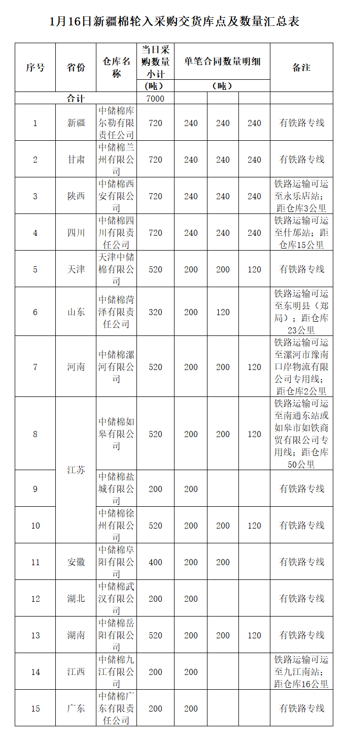 中國儲備棉管理有限公司定于2020年1月16日采購新疆棉7000噸(公定重量),最高限價14107元/噸(折標(biāo)準(zhǔn)級3128B價格)。具體庫點及數(shù)量如下: