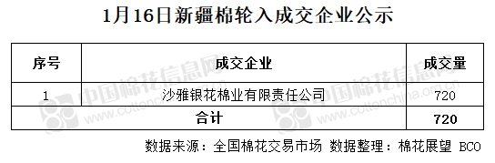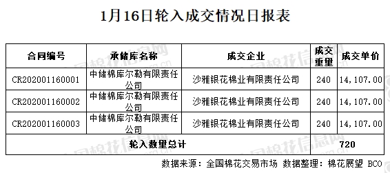 1月16日,中國儲備棉管理有限公司計劃采購新疆棉7000噸,實際成交720噸,成交率10.29%,成交均價14107元/噸。 其中新疆庫成交720噸,內(nèi)地庫成交0噸。