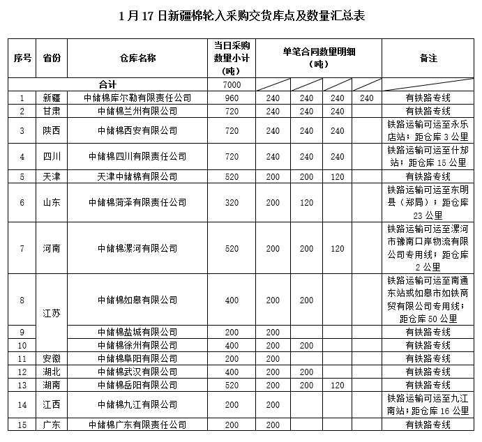 中國儲(chǔ)備棉管理有限公司定于2020年1月17日采購新疆棉7000噸(公定重量),最高限價(jià)14107元/噸(折標(biāo)準(zhǔn)級(jí)3128B價(jià)格)。具體庫點(diǎn)及數(shù)量如下: