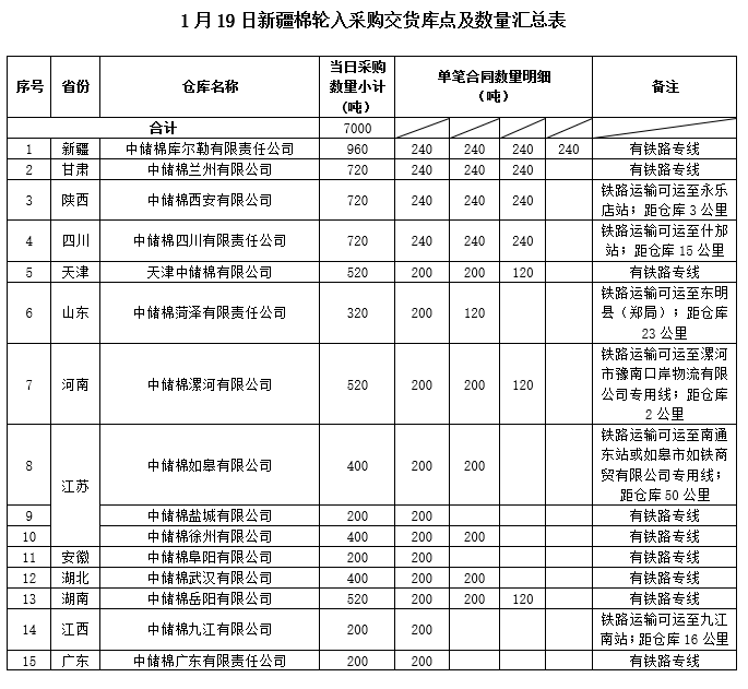 中國儲備棉管理有限公司定于2020年1月19日采購新疆棉7000噸(公定重量),最高限價14107元/噸(折標準級3128B價格)。具體庫點及數(shù)量如下:
