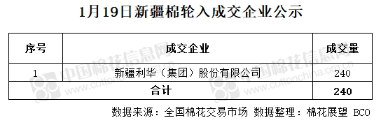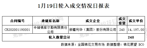 1月19日,中國儲(chǔ)備棉管理有限公司計(jì)劃采購新疆棉7000噸,實(shí)際成交240噸,成交率3.43%,成交均價(jià)14197元/噸。 其中新疆庫成交240噸,內(nèi)地庫成交0噸。