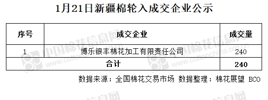 1月21日,中國儲備棉管理有限公司計劃采購新疆棉7000噸,實(shí)際成交720噸,成交率10.29%,成交均價14197元/噸。 其中新疆庫成交0噸,內(nèi)地庫成交720噸。