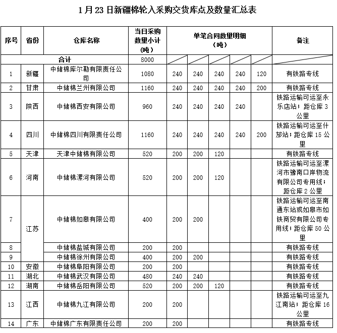 中國儲備棉管理有限公司定于2020年1月23日采購新疆棉8000噸(公定重量),最高限價14107元/噸(折標(biāo)準級3128B價格)。具體庫點及數(shù)量如下: