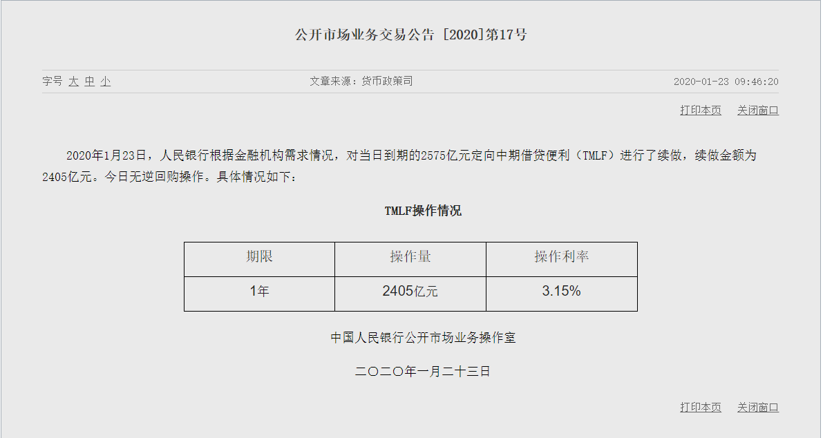 今日中國央行開展定向中期借貸便利(TMLF)操作2405億元,為一年期,利率為3.15%,與此前持平。
