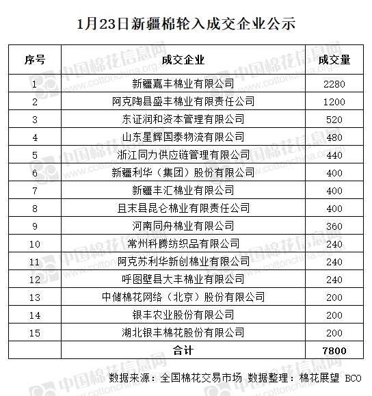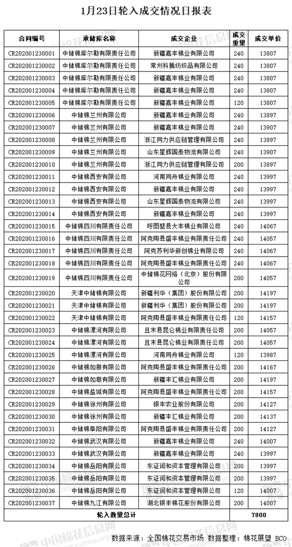 1月23日,中國儲備棉管理有限公司計劃采購新疆棉8000噸,實際成交7800噸,成交率97.50%,成交均價14006元/噸,最高成交價14197元/噸,最低成交價13807元/噸。 其中新疆庫成交1080噸,內(nèi)地庫成交6720噸。