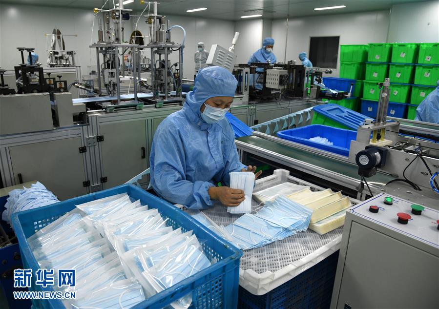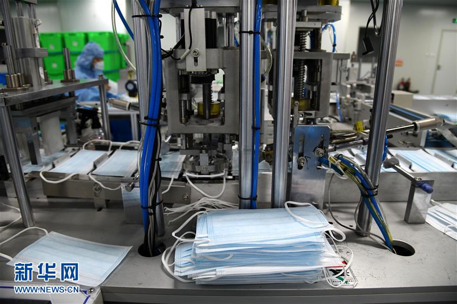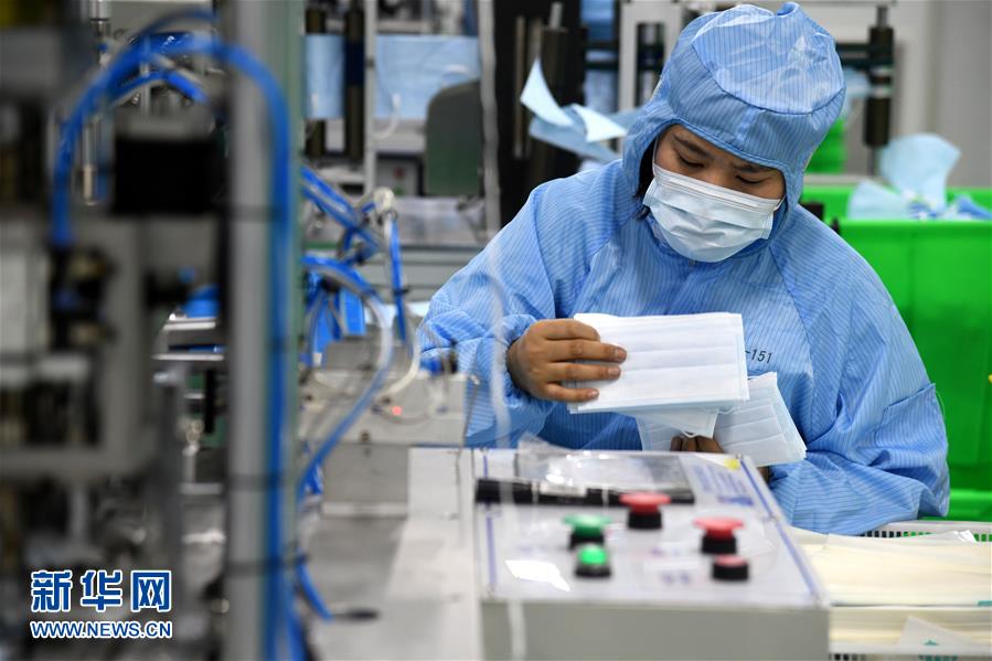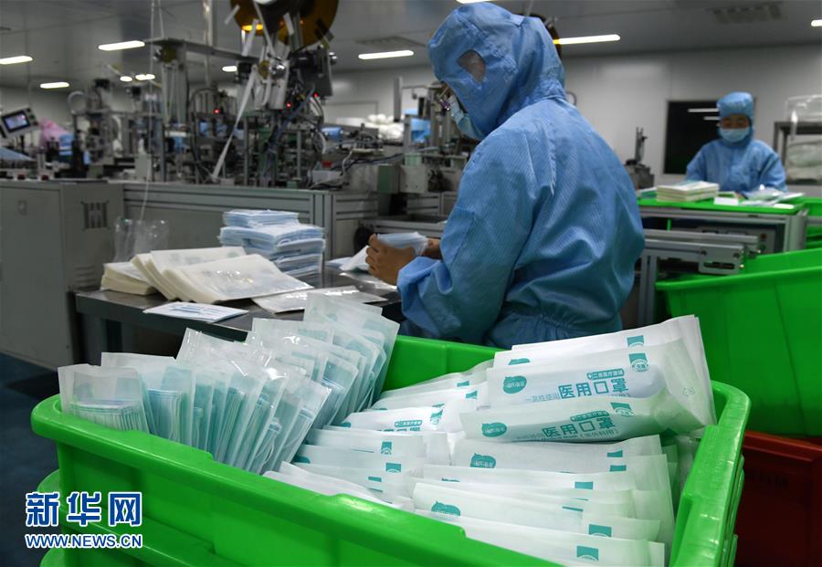 1月28日,在青島海諾生物工程有限公司生產(chǎn)車間,工作人員在嚴(yán)格消毒環(huán)境下生產(chǎn)醫(yī)用口罩。連日來,青島各醫(yī)療防護(hù)用品生產(chǎn)企業(yè)緊急取消春節(jié)休假,全力生產(chǎn)醫(yī)用口罩等防護(hù)用品。
