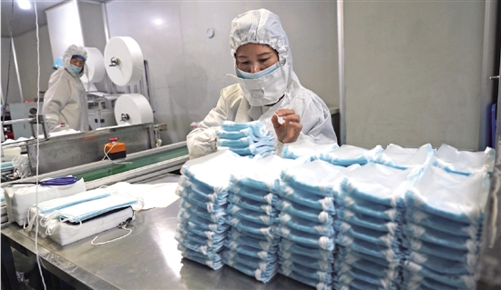在位于江西省南昌市進(jìn)賢縣的南昌朝陽(yáng)醫(yī)療保健用品有限公司生產(chǎn)車間,工人在加緊生產(chǎn)口罩(2月1日攝)。