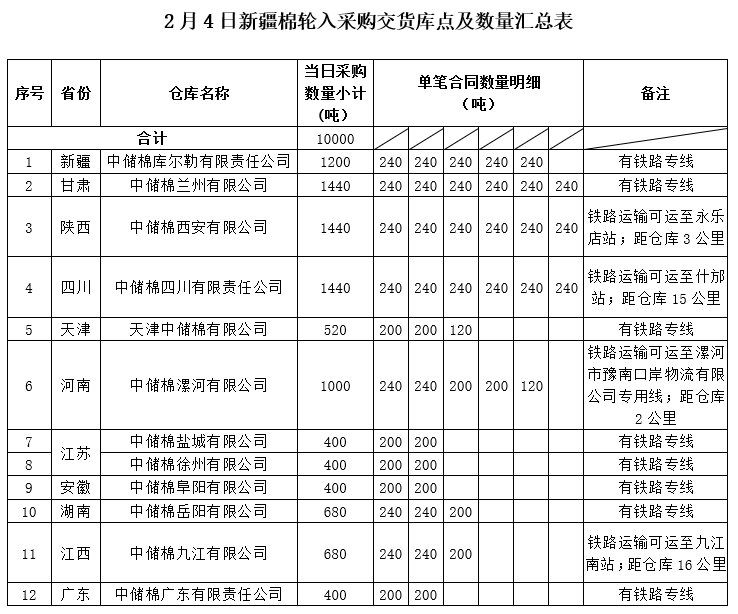 中國儲(chǔ)備棉管理有限公司定于2020年2月4日采購新疆棉10000噸(公定重量),最高限價(jià)14135元/噸(折標(biāo)準(zhǔn)級(jí)3128B價(jià)格)。具體庫點(diǎn)及數(shù)量如下: