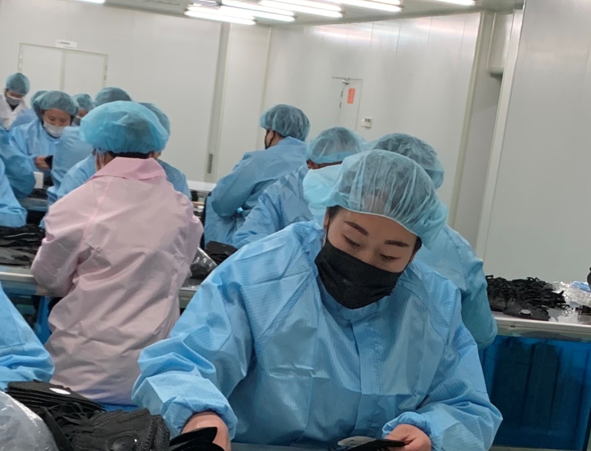復(fù)產(chǎn)后的生產(chǎn)車(chē)間里工人正在整理口罩。