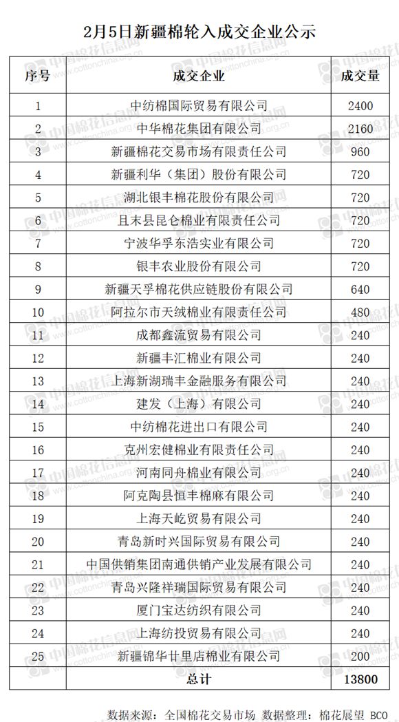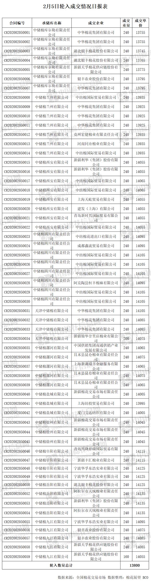 2月5日,中國儲備棉管理有限公司計(jì)劃采購新疆棉15000噸,實(shí)際成交13800噸,成交率92%,成交均價14024元/噸,最高成交價14135元/噸,最低成交價13745元/噸。 其中新疆庫成交1680噸,內(nèi)地庫成交12120噸。