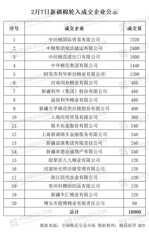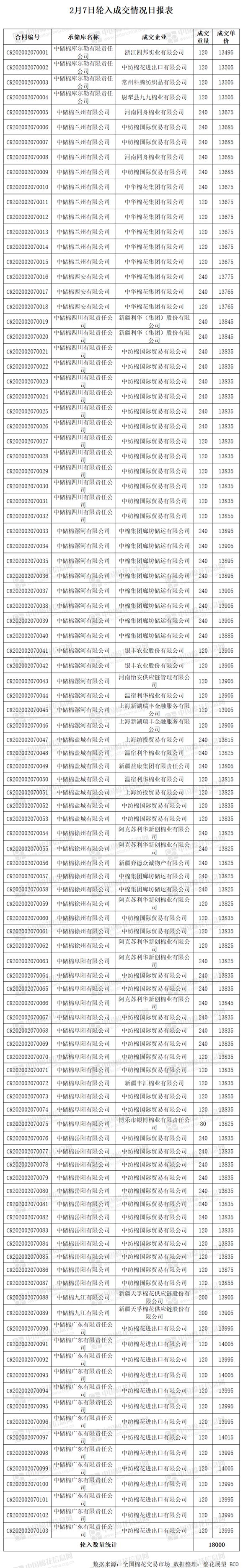 2月7日,中國儲(chǔ)備棉管理有限公司計(jì)劃采購新疆棉18000噸,實(shí)際成交18000噸,成交率100%,成交均價(jià)13832元/噸,最高成交價(jià)14015元/噸,最低成交價(jià)13495元/噸。 其中新疆庫成交480噸,內(nèi)地庫成交17520噸。