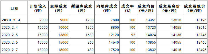 受新冠肺炎疫情影響,下游紡企復(fù)工日期延遲,節(jié)后開盤首日鄭棉一度出現(xiàn)跌停,主力合約價格創(chuàng)下近3年來新低。在行情出現(xiàn)急劇震蕩時,中儲棉公司持續(xù)加大新疆棉輪入數(shù)量,從日掛牌量7000噸增加至18000噸,由于企業(yè)暫時對后市悲觀,趁勢積極競拍,幾乎100%成交,希望盡快回籠資金落袋為安。當(dāng)周收儲有效緩解市場恐慌情緒,穩(wěn)定棉價,鄭棉連續(xù)大幅反彈,重新站上13000元/噸關(guān)口。隨著疫情逐步得到防控,市場信心有望進(jìn)一步恢復(fù),特別是臨近下游企業(yè)不同程度復(fù)工之際,市場棉價有望繼續(xù)得到穩(wěn)固。