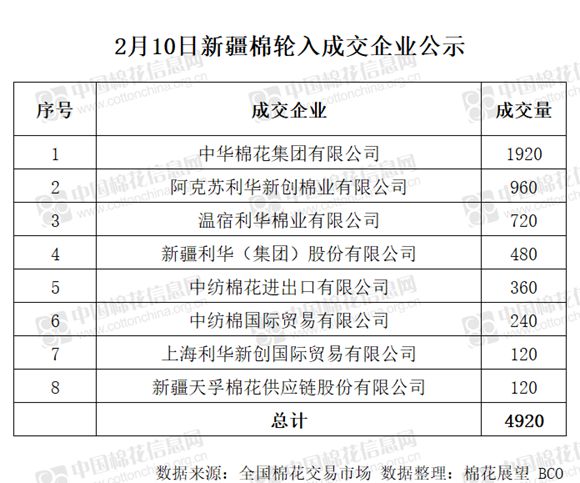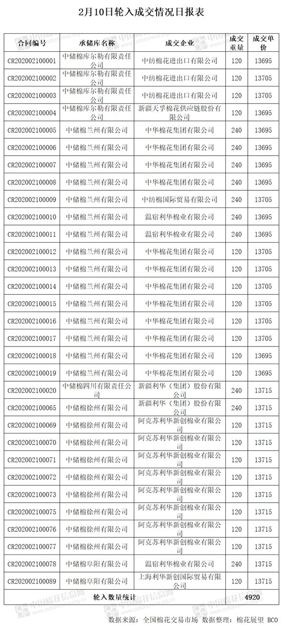 2月10日,中國儲備棉管理有限公司計劃采購新疆棉18000噸,實際成交4920噸,成交率27.33%,成交均價13705元/噸,最高成交價13715元/噸,最低成交價13695元/噸。 其中新疆庫成交480噸,內(nèi)地庫成交4440噸。
