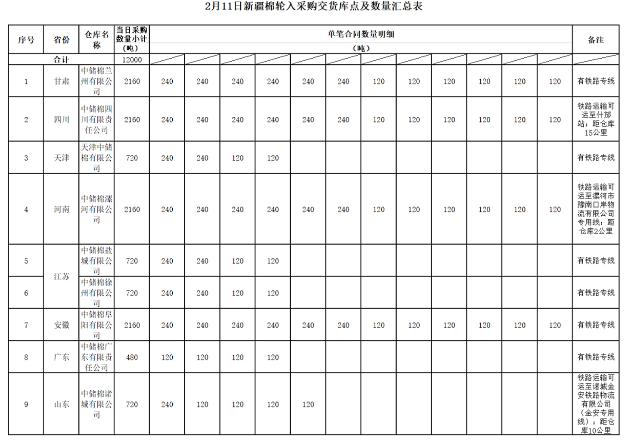 中國儲(chǔ)備棉管理有限公司定于2020年2月11日采購新疆棉12000噸(公定重量),最高限價(jià)14135元/噸(折標(biāo)準(zhǔn)級(jí)3128B價(jià)格)。具體庫點(diǎn)及數(shù)量如下: