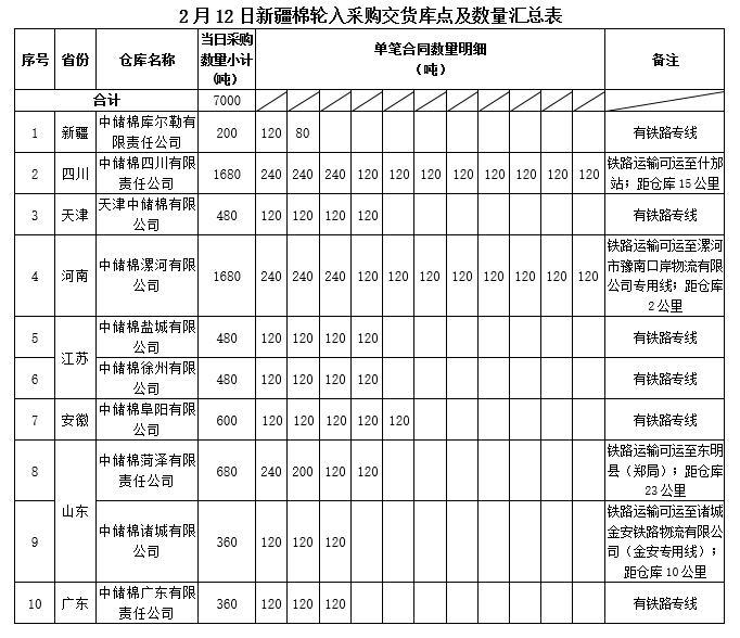 中國(guó)儲(chǔ)備棉管理有限公司定于2020年2月12日采購(gòu)新疆棉7000噸(公定重量),最高限價(jià)14135元/噸(折標(biāo)準(zhǔn)級(jí)3128B價(jià)格)。具體庫(kù)點(diǎn)及數(shù)量如下: