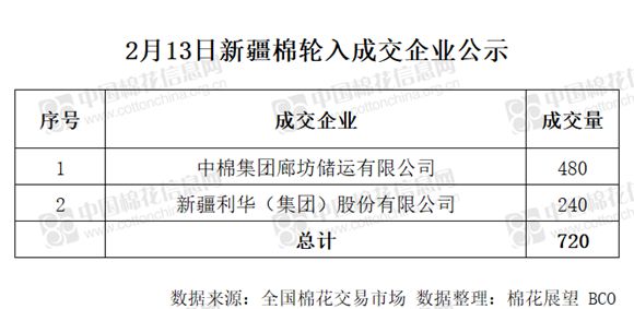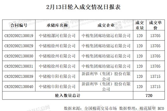 2月13日,中國儲備棉管理有限公司計(jì)劃采購新疆棉7000噸,實(shí)際成交720噸,成交率10.29%,成交均價13708元/噸,最高成交價13715元/噸,最低成交價13705元/噸。 其中內(nèi)地庫成交720噸。