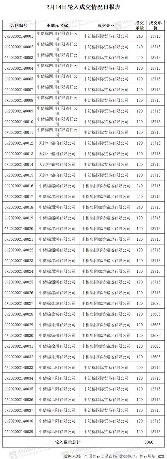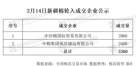2月14日,中國(guó)儲(chǔ)備棉管理有限公司計(jì)劃采購(gòu)新疆棉7000噸,實(shí)際成交5360噸,成交率76.57%,成交均價(jià)13711元/噸,最高成交價(jià)13715元/噸,最低成交價(jià)13685元/噸。 其中內(nèi)地庫(kù)成交5360噸。