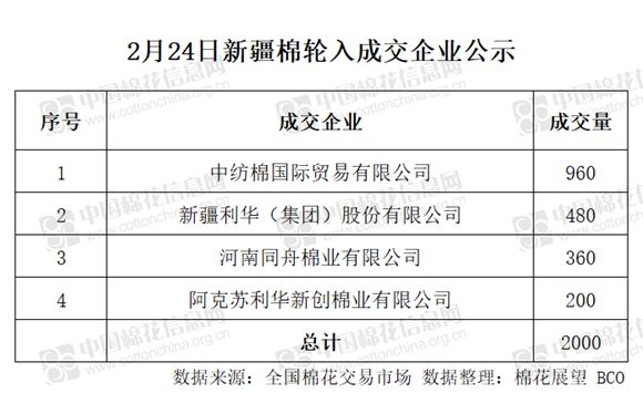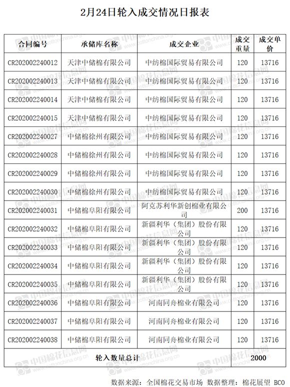 2月24日,中國儲備棉管理有限公司計劃采購新疆棉7000噸,實際成交2000噸,成交率28.57%,成交均價13716元/噸。 其中內(nèi)地庫成交2000噸。