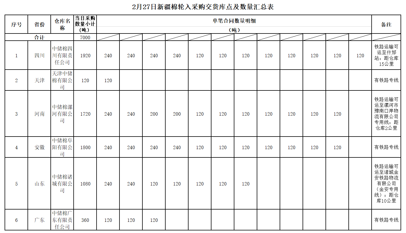 中國儲備棉管理有限公司定于2020年2月27日采購新疆棉7000噸(公定重量),最高限價13716元/噸(折標(biāo)準(zhǔn)級3128B價格)。具體庫點(diǎn)及數(shù)量如下: