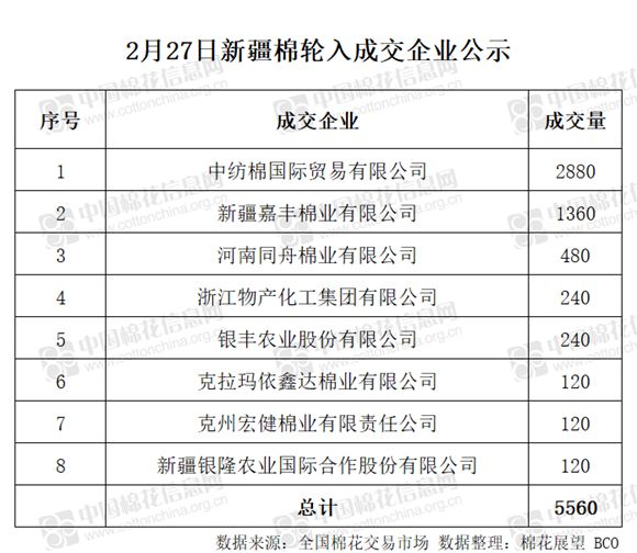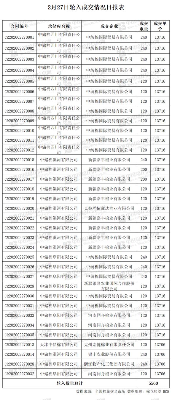 2月27日,中國儲(chǔ)備棉管理有限公司計(jì)劃采購新疆棉7000噸,實(shí)際成交5560噸,成交率79.43%,成交均價(jià)13715元/噸。 其中內(nèi)地庫成交5560噸。
