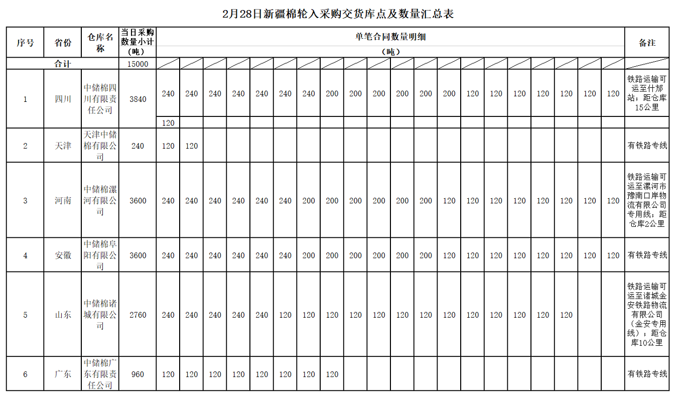 中國儲備棉管理有限公司定于2020年2月28日采購新疆棉15000噸(公定重量),最高限價13716元/噸(折標準級3128B價格)。具體庫點及數(shù)量如下: