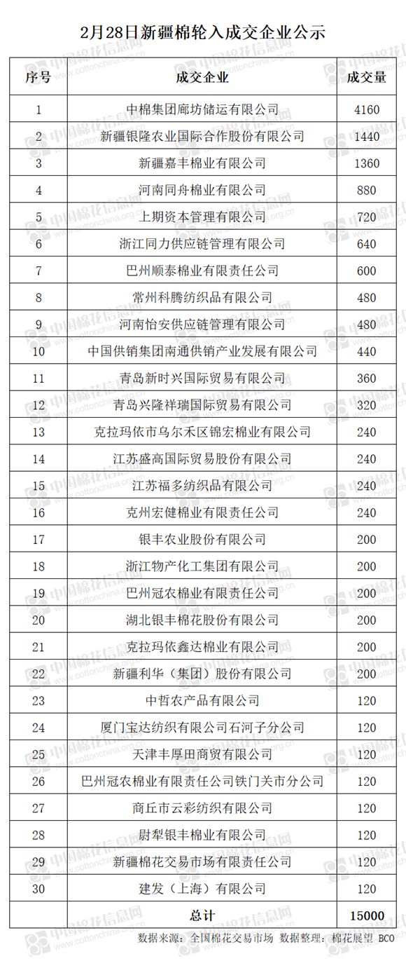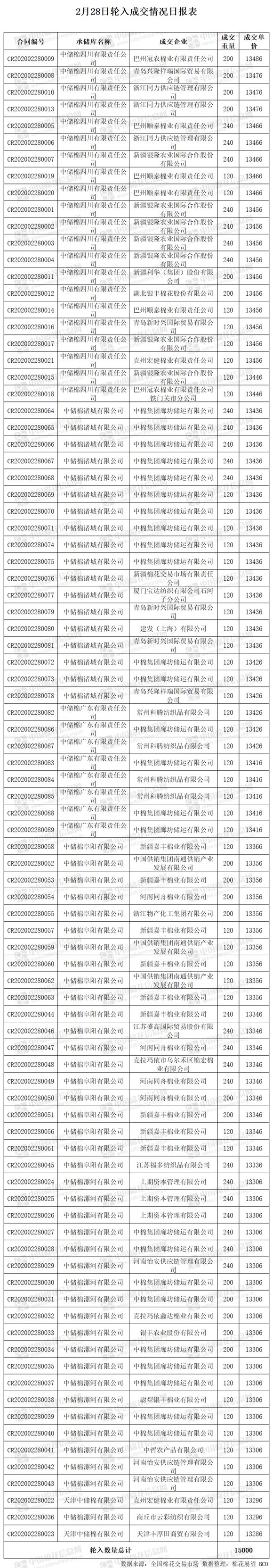 2月28日,中國儲(chǔ)備棉管理有限公司計(jì)劃采購新疆棉15000噸,實(shí)際成交15000噸,成交率100%,成交均價(jià)13387元/噸。 其中內(nèi)地庫成交15000噸。