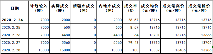 截至2月28日累計(jì)掛牌采購(gòu)47.0萬(wàn)噸,累計(jì)成交均價(jià)13652元/噸,成交最高價(jià)14197元/噸,成交最低價(jià)12879元/噸。