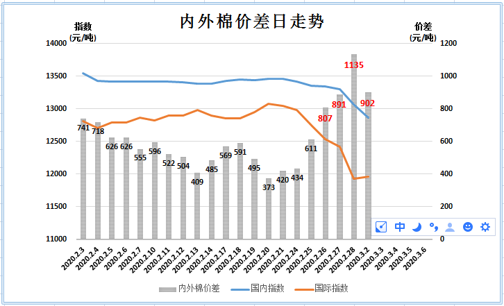 3月2日開(kāi)始暫停新疆棉輪入掛牌交易,3月2日內(nèi)外棉價(jià)差902元/噸,較2月28日的1135元/噸回落233元/噸。