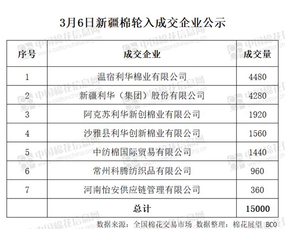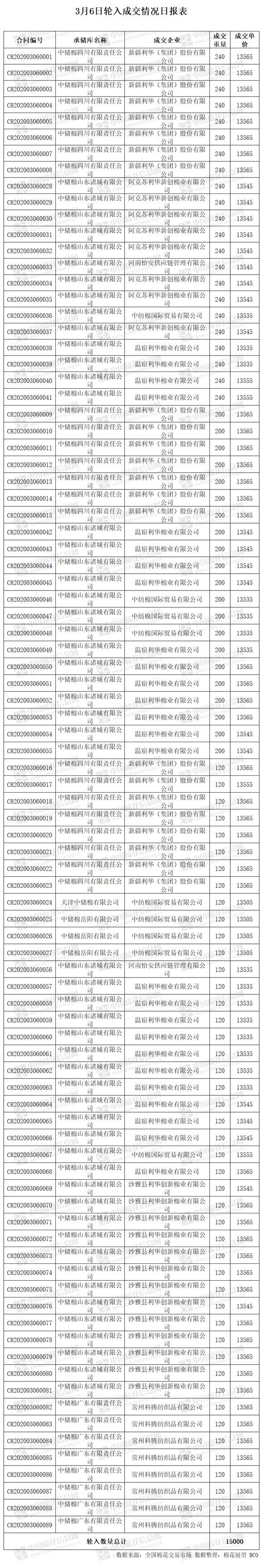 3月6日,中國儲備棉管理有限公司計劃采購新疆棉15000噸,實際成交15000噸,成交率100%,成交均價13552元/噸。 其中內(nèi)地庫成交15000噸。