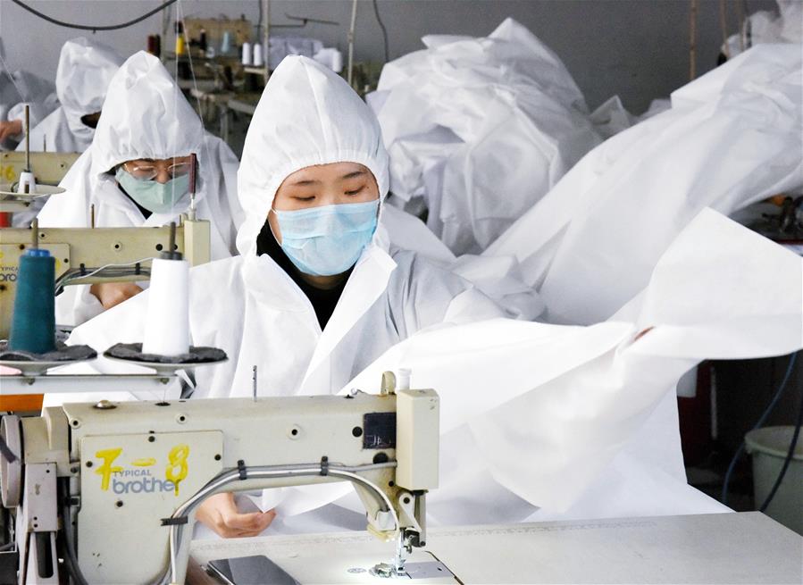 3月9日,青島莊正職業(yè)服裝有限公司員工在生產(chǎn)隔離衣。 近日,山東省青島莊正職業(yè)服裝有限公司響應(yīng)政府號(hào)召,轉(zhuǎn)型生產(chǎn)隔離衣,日產(chǎn)約200套。