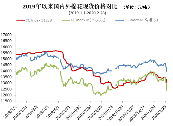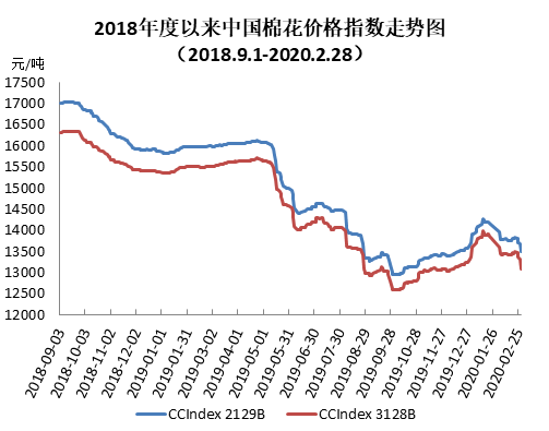 2月,受新冠病毒疫情影響,國內(nèi)棉紡織企業(yè)延遲開工,中下旬復(fù)工復(fù)產(chǎn)比例逐漸增加,復(fù)工后企業(yè)生產(chǎn)及銷售仍有各種困難,市場啟動緩慢,買賣雙方交投清淡,國內(nèi)棉花現(xiàn)貨價格、紡織棉紗類及滌綸、化纖等產(chǎn)品價格均下跌。同期,國際棉價大幅下跌,月末外棉現(xiàn)貨價格低于國內(nèi)。