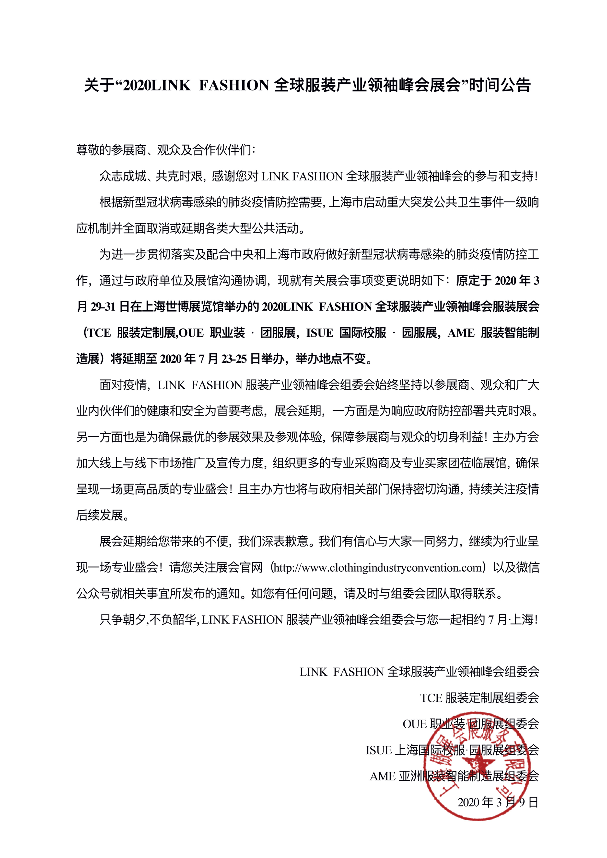 為進(jìn)一步貫徹落實(shí)及配合中央和上海市政府做好新型冠狀病毒感染的肺炎疫情防控工作,通過(guò)與政府單位及展館溝通協(xié)調(diào),現(xiàn)就有關(guān)展會(huì)事項(xiàng)變更說(shuō)明如下:原定于2020年3月29-31日在上海世博展覽館舉辦的2020LINK FASHION全球服裝產(chǎn)業(yè)領(lǐng)袖峰會(huì)服裝展會(huì)(TCE服裝定制展、OUE職業(yè)裝·團(tuán)服展、ISUE國(guó)際校服·園服展、AME服裝智能制造展)延期調(diào)整如下: